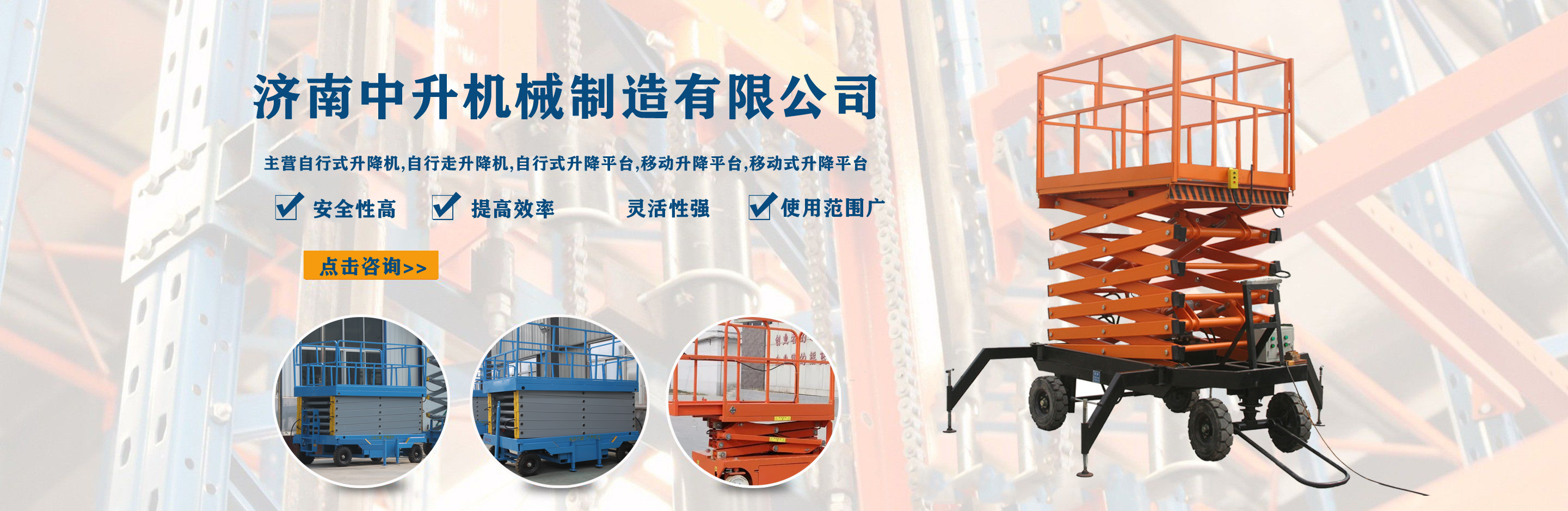 濟(jì)南中升機(jī)械制造有限公司主營(yíng)自行式升降機(jī),自行走升降機(jī),自行式升降平臺(tái),移動(dòng)升降平臺(tái),移動(dòng)式升降平臺(tái)等產(chǎn)品,產(chǎn)品廣泛用于廠房維護(hù)、工業(yè)安裝、設(shè)備檢修、物業(yè)管理、倉(cāng)庫(kù)、航空、機(jī)場(chǎng)、港口、車(chē)站、加油站、體育場(chǎng)、展覽館等多種行業(yè)和場(chǎng)所, 公司設(shè)備精良、工藝合理、檢測(cè)手段齊全,技術(shù)力量充足,公司創(chuàng)立伊始即本著“專(zhuān)注、專(zhuān)心”的經(jīng)營(yíng)理念,依托技術(shù)團(tuán)隊(duì)優(yōu)勢(shì)和設(shè)備硬件保障,全力打造良心的升降平臺(tái)企業(yè)。 我公司始終以“品質(zhì)為本,服務(wù)至上”作為企業(yè)宗旨。只要你訂購(gòu)了我公司的產(chǎn)品,無(wú)論你身處何方,我們都會(huì)及時(shí)派出技術(shù)人員為你服務(wù)!...